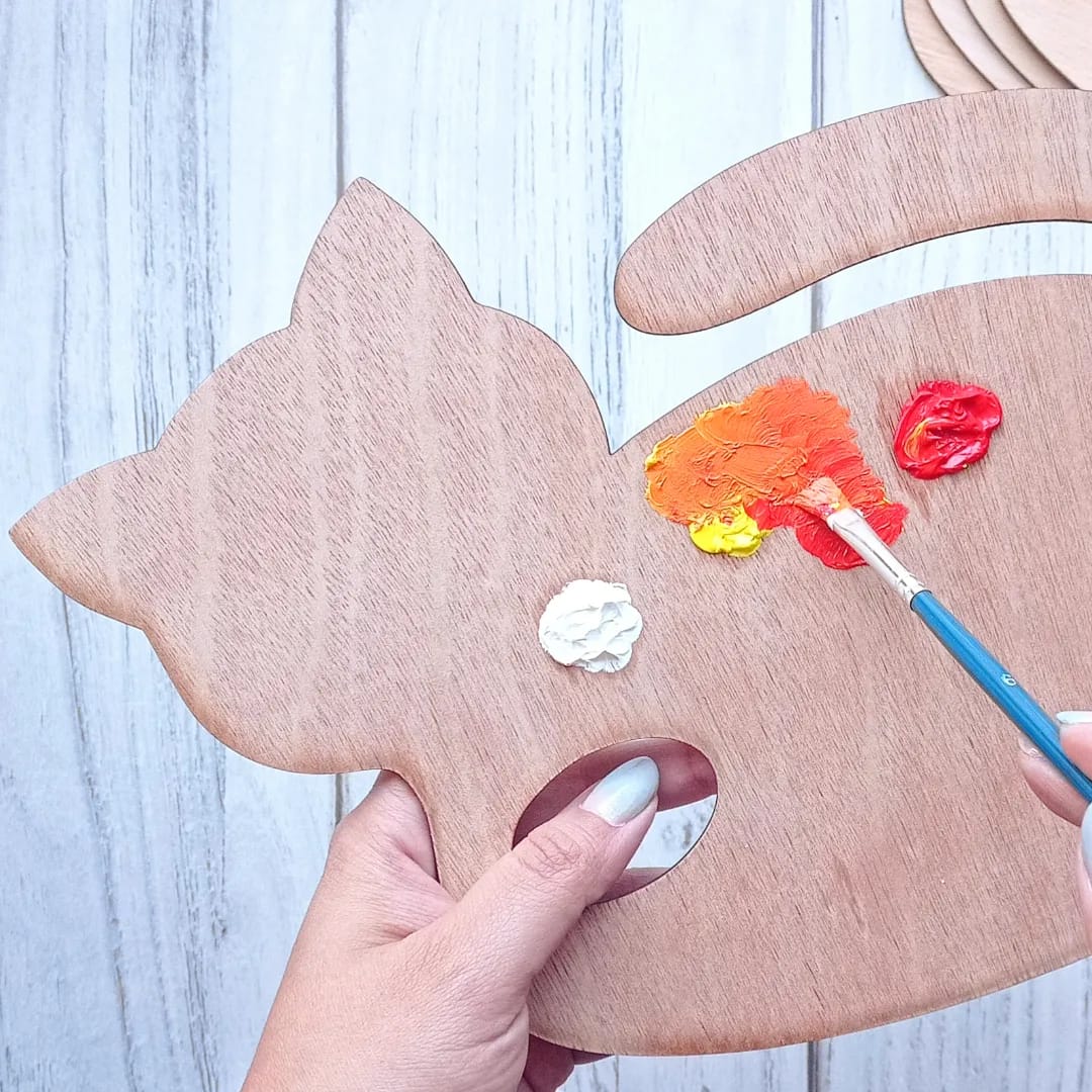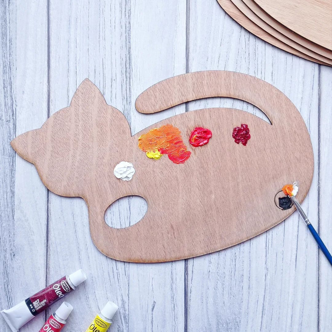 Hermosa paleta mezcladora de madera con forma de gato. Ideal para trabajar a gusto y puedas crear colores fácil y divertidamente.