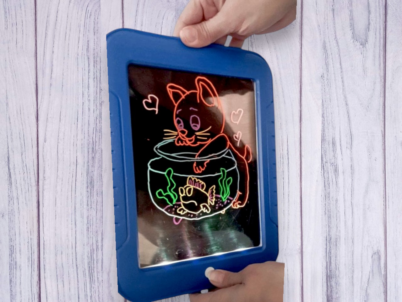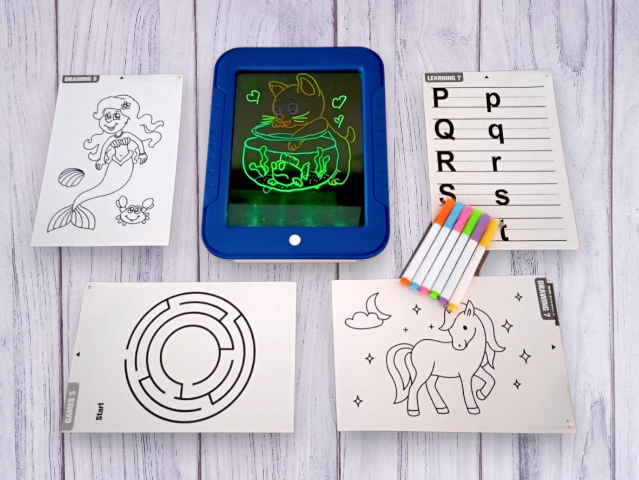 Esta Pizarra Magica de luz es una tableta de dibujo que hará volar la imaginación de los más pequeños. Con su color vibrante y su diseño ergonómico, es perfecto para niños a partir de los 3 años. La pizarra incluye 6 lapices de colores Neón que permite dibujar o escribir, y que cuando enciendes la luz cambia de color dependiendo del color que la pizarra esta emitiendo.